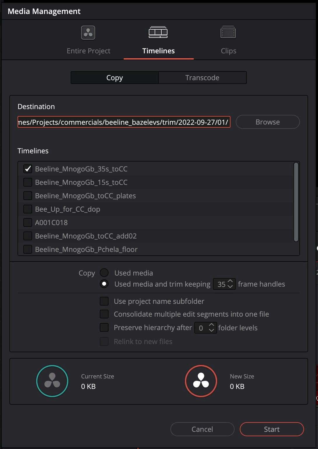 Choose a timeline that you need to collect, then either “Used media” or “Used media and trim keeping XX handles” (the length of the handles is at the request of the client)